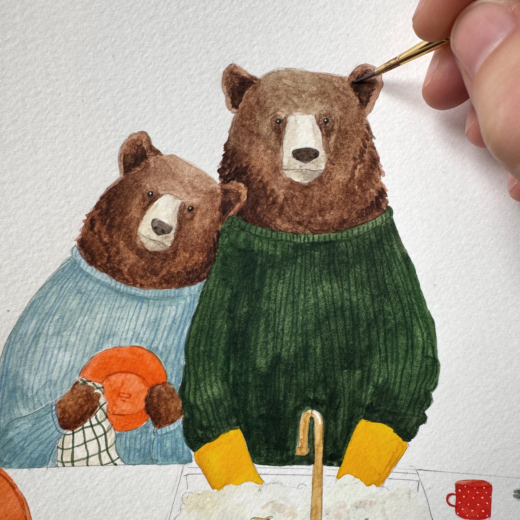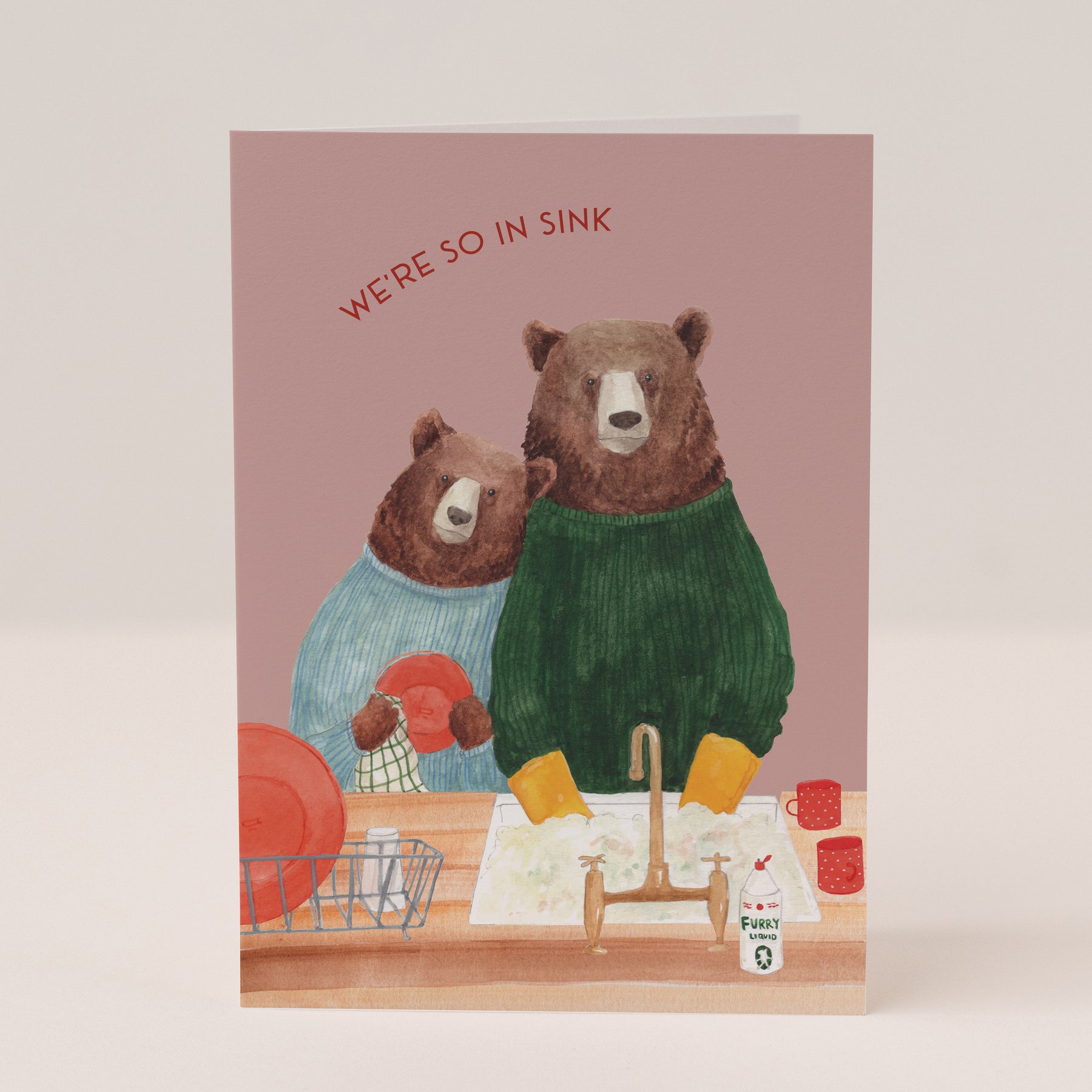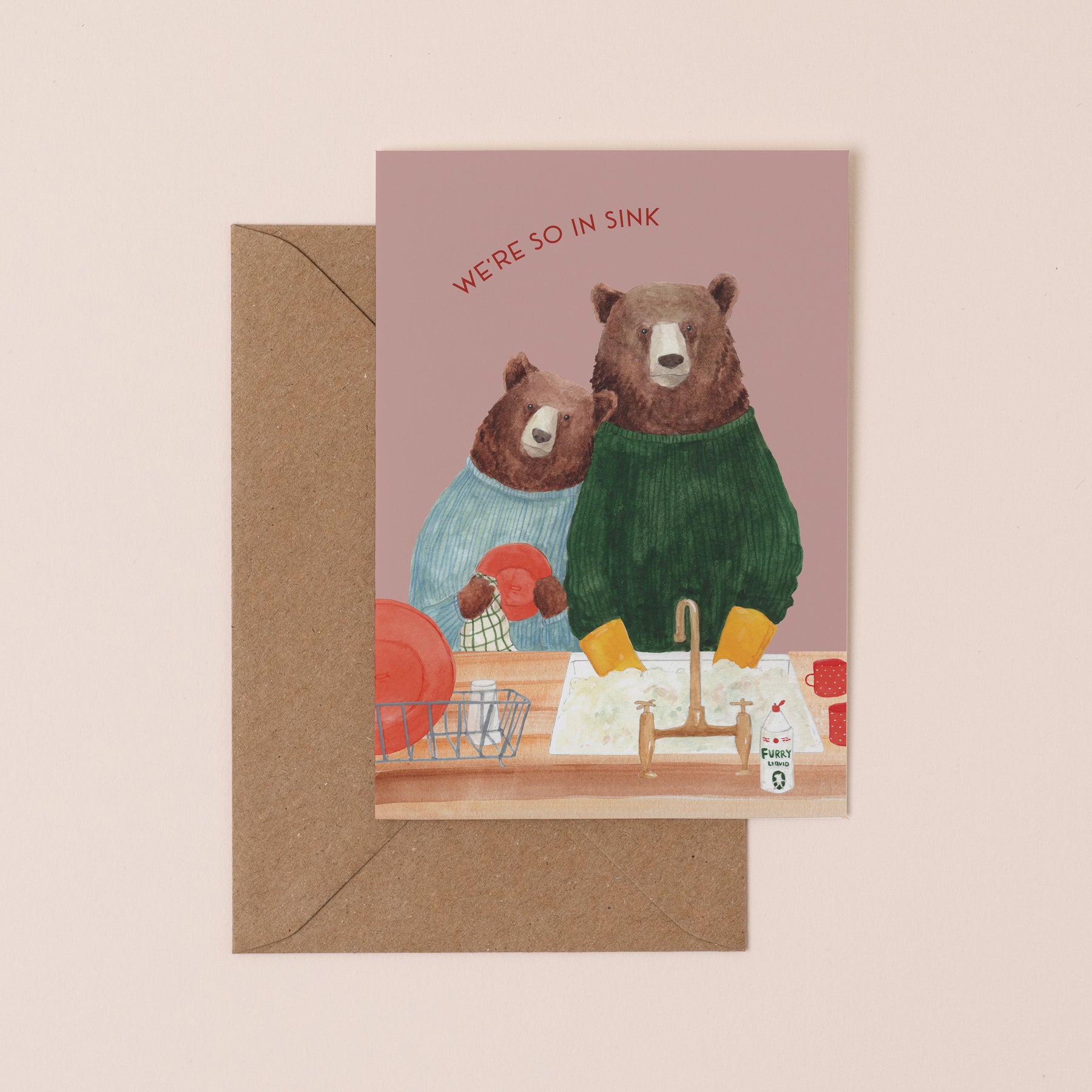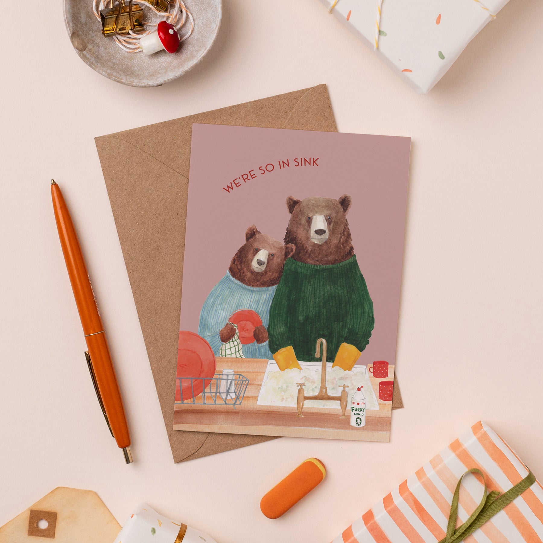 An A6 size card, measures 10.5 x 14.8cm, printed on thick matt card in the UK from an original watercolour illustration of 2 bears doing the dishes.