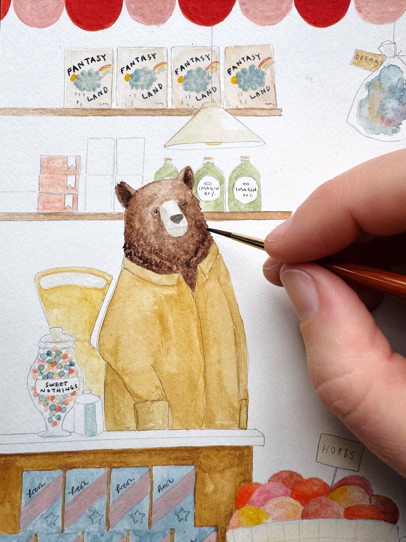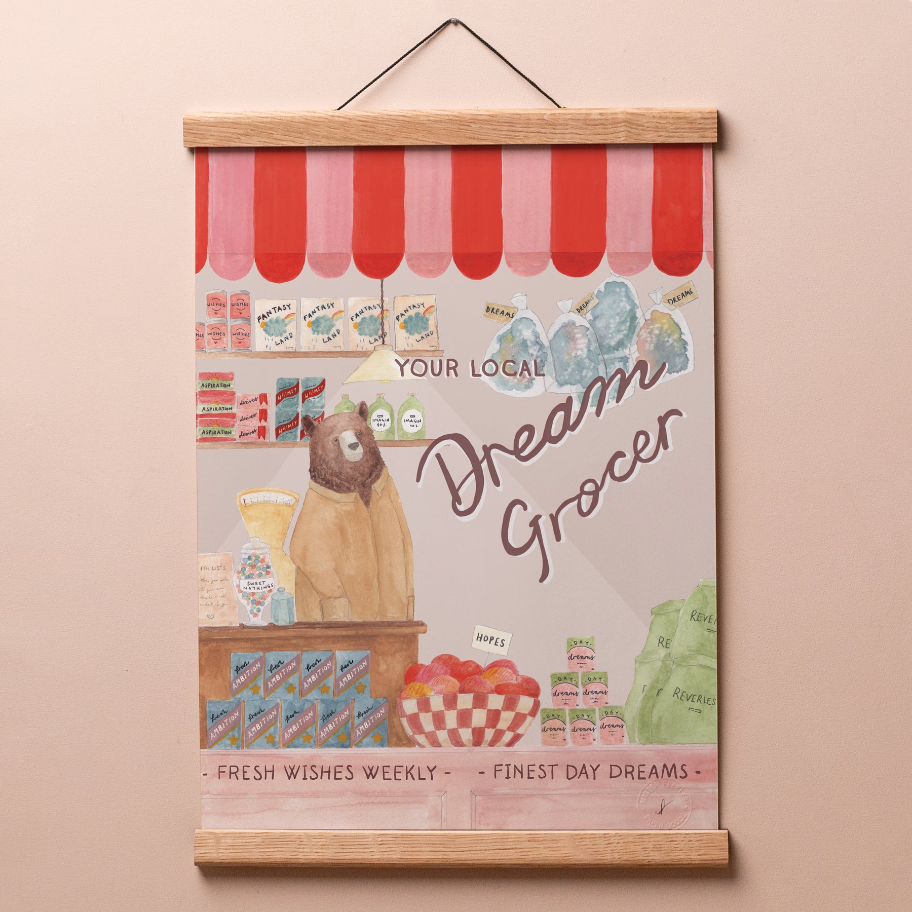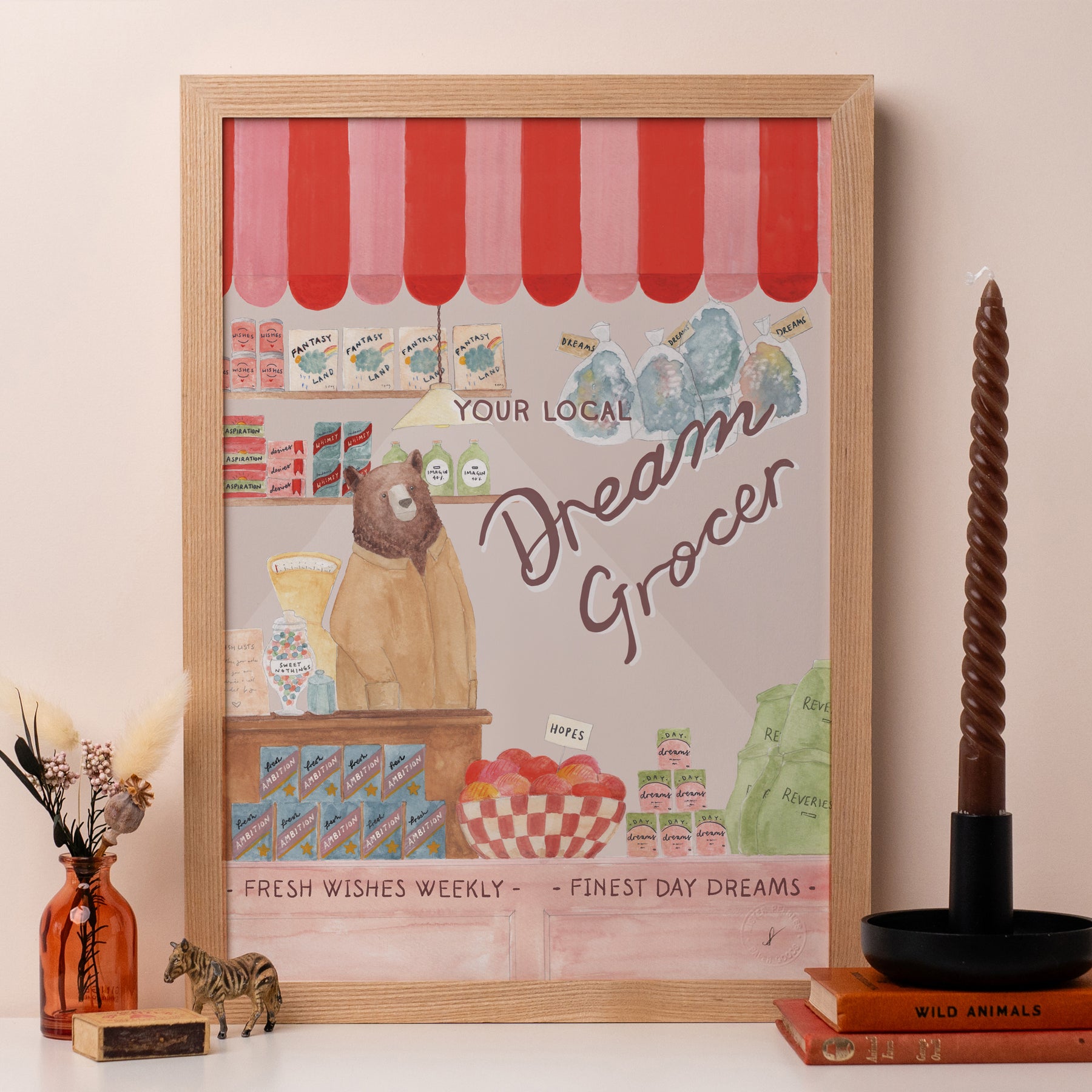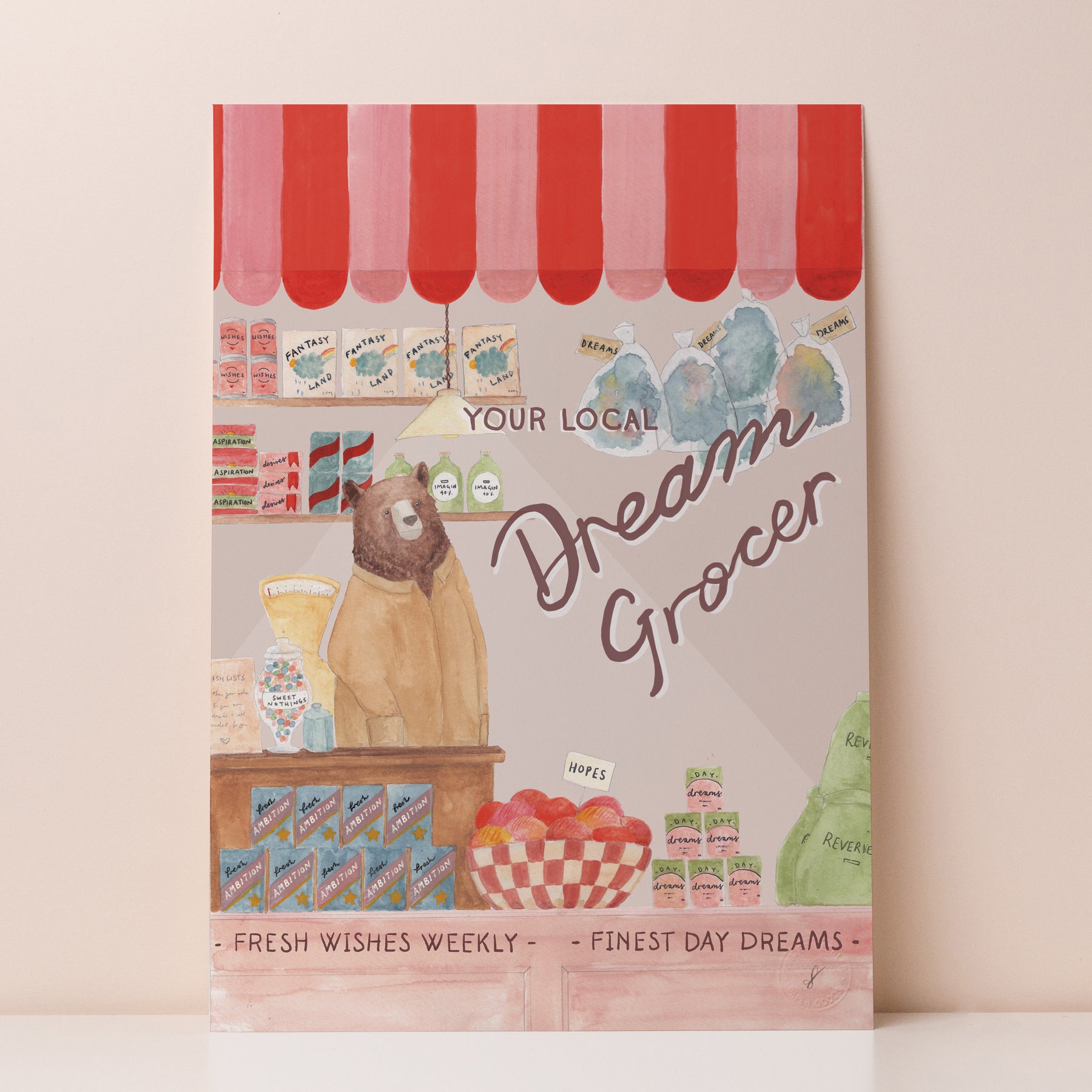 Wall art printed in the studio onto high quality 300gsm paper stock, from a watercolour illustration of a bear shopkeeper, bringing dreams to the local high street.