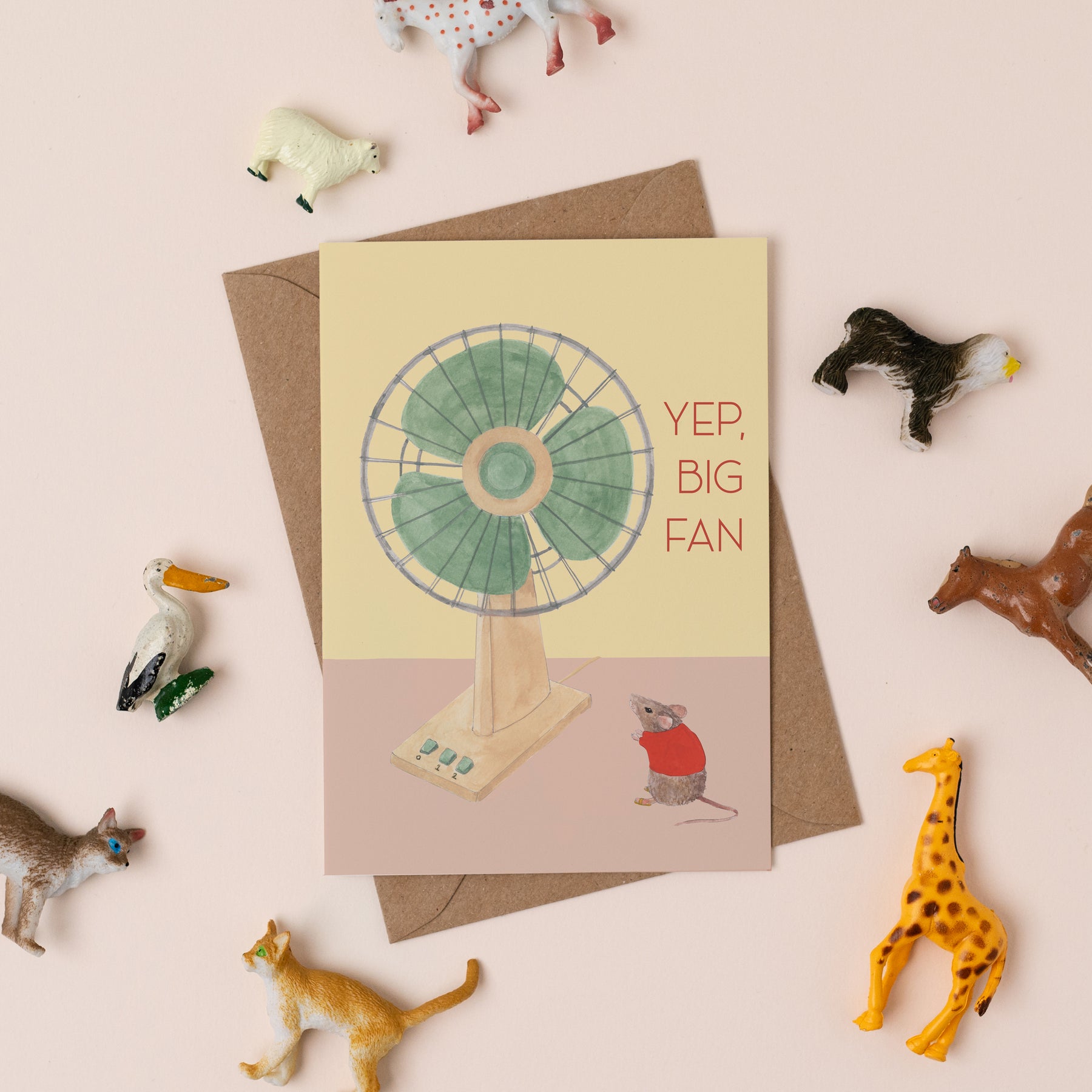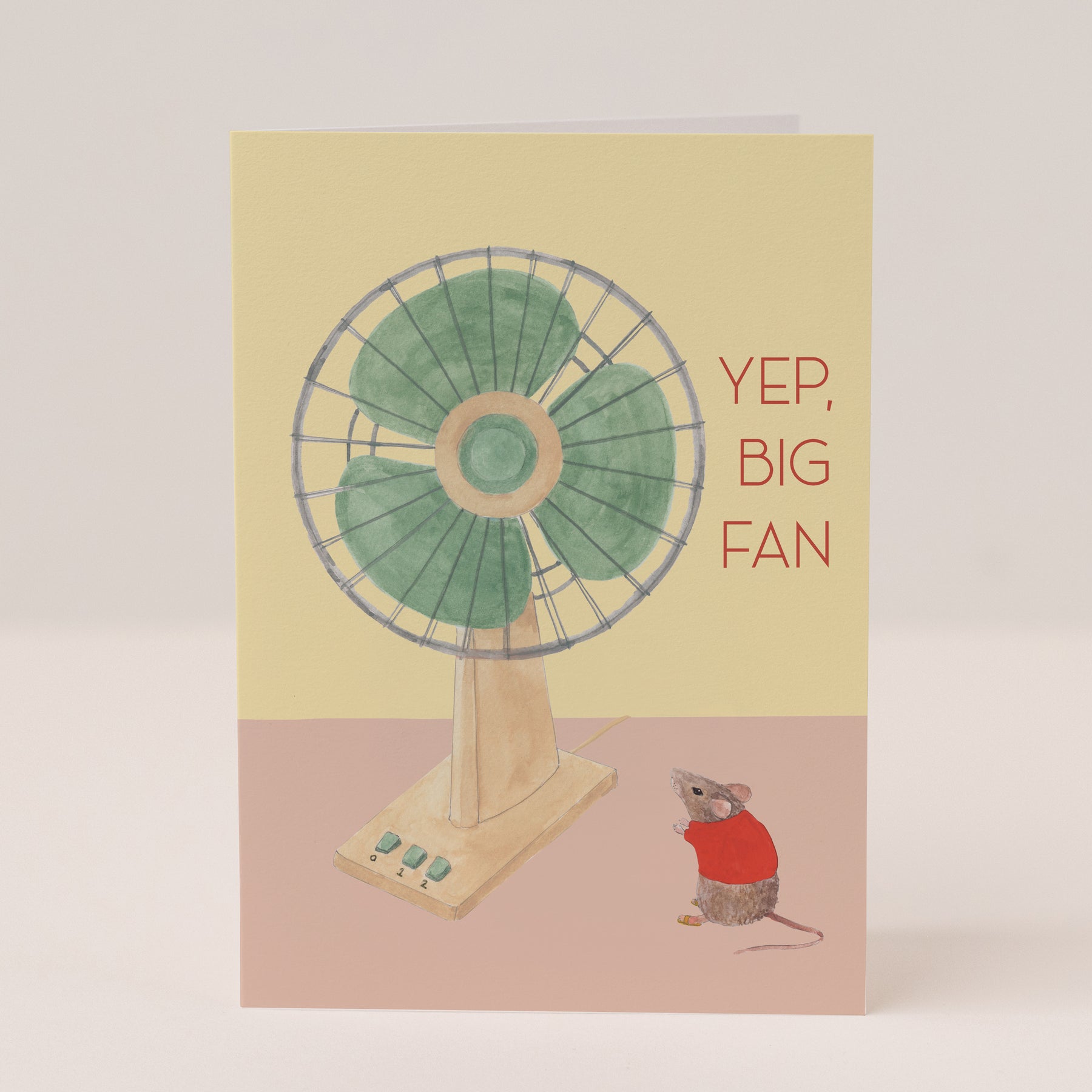 An A6 size card, measures 10.5 x 14.8cm, printed on thick matt card in the UK from an original watercolour illustration. A little mouse who's a very big fan.